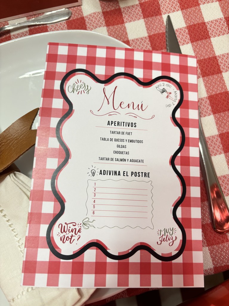 - Diseño gráfico personalizado: Creamos tarjetas con los nombres de cada invitada, menús temáticos y un divertido juego que desafiaba a las asistentes a adivinar los siete postres artesanales que degustarían durante la celebración.